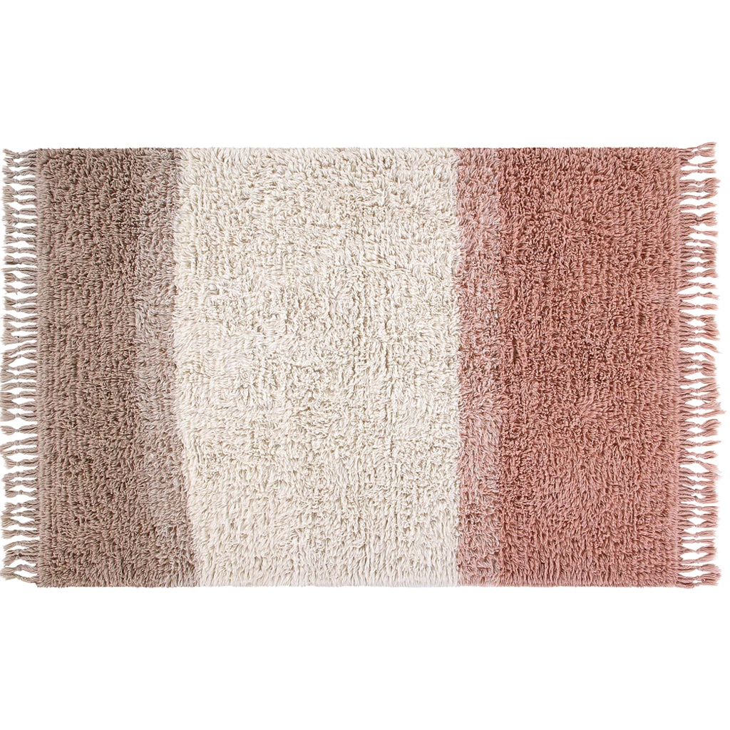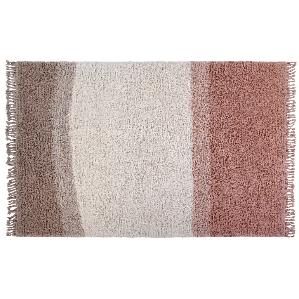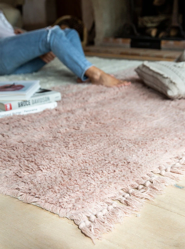 Rectangular washable wool rug in soft, beautiful color shades of Dusty Pink, Natural and Champagne. Home decor environments are made of these three cozy soft colors. Finished with handmade cross-knotted wool fringes at edges.