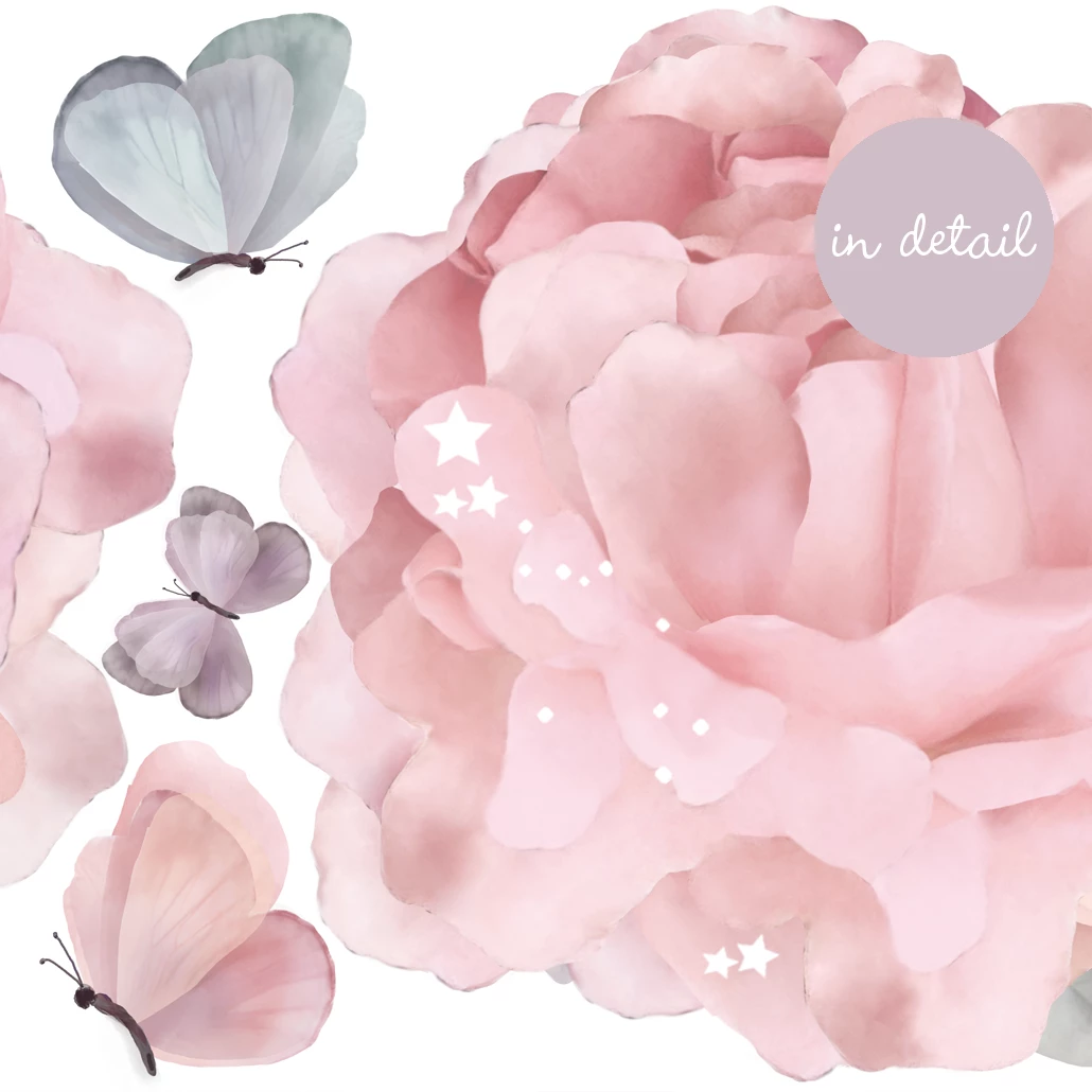 Peek into a land of fairytales and hidden adventure. A secret garden found nestled in a faraway kingdom where butterflies dance amongst the soft petals of pink peonies. Transform your child’s bedroom into a magical wonderland with Schmooks large floral wall stickers ‘Peonies & Butterflies’.