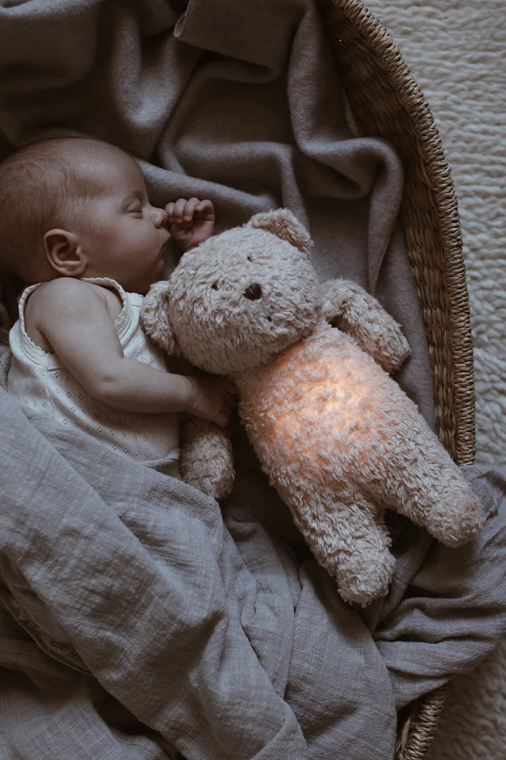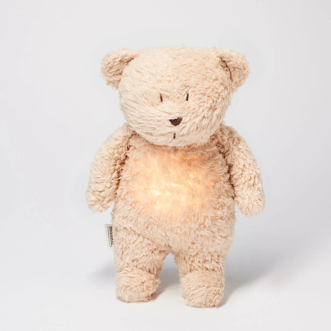 The Moonie Humming organic bear in sand features 5 different sounds, 7 different light settings and the best thing ever, a built in ‘cry’ feature, meaning if crying sounds are detected the bear will automatically activate to sooth your baby back to sleep. Beautifully packed and makes for the perfect gift for a newborn