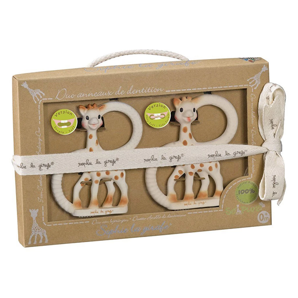 This twin pack of Sophie the Giraffe teething rings come in a beautiful box with ribbon, making a great gift. These teething toys are ideal for soothing baby’s painful gums when they are at that teething stage and they also have easy grip handles.