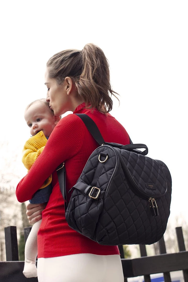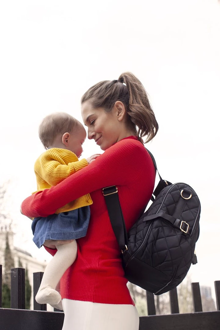 New for AW19 is the Storksak Poppy baby changing bag is back with a new design! Crafted from durable quilted nylon, accented by subtle hardware details adding an elegant touch to this practical design. Effortlessly convert this style from shoulder bag to backpack with the pull through nylon strap.