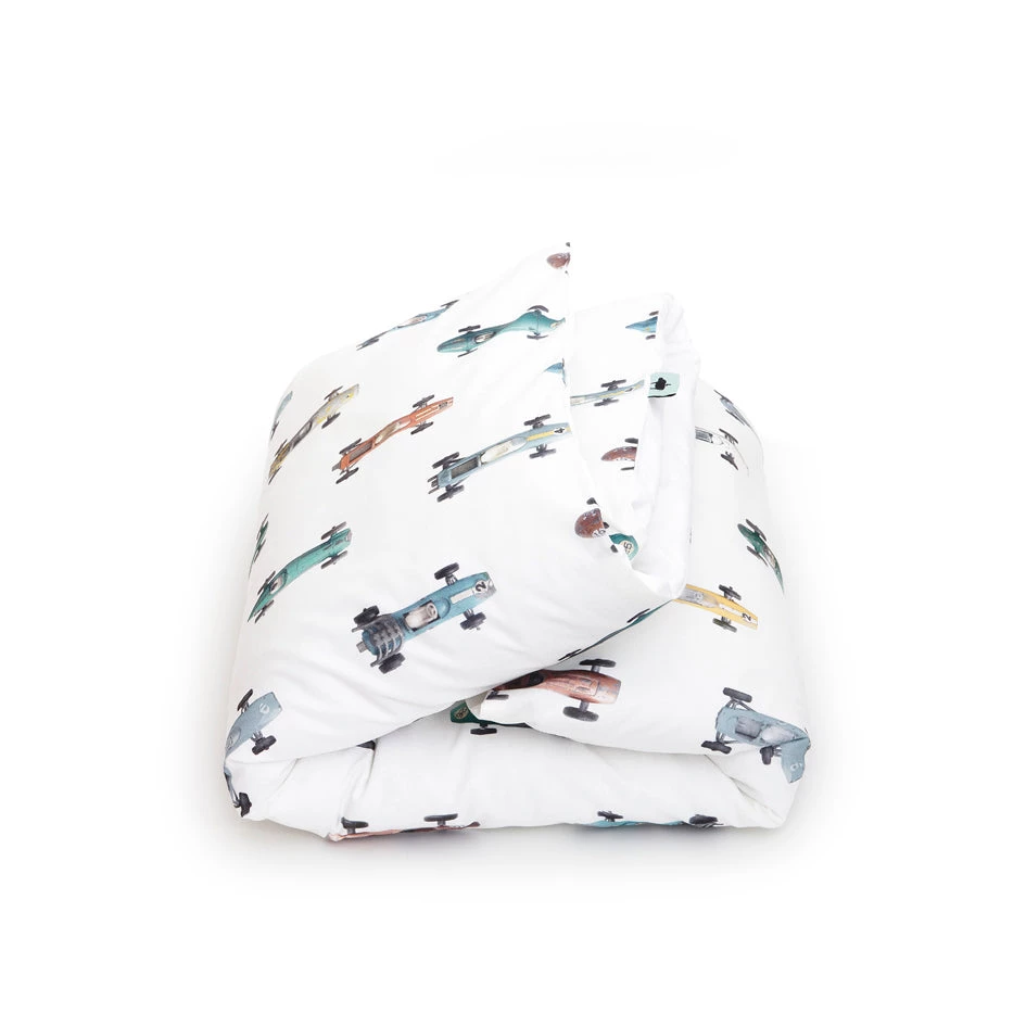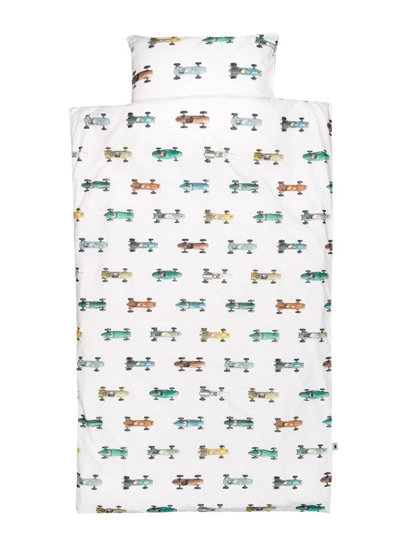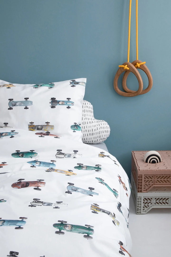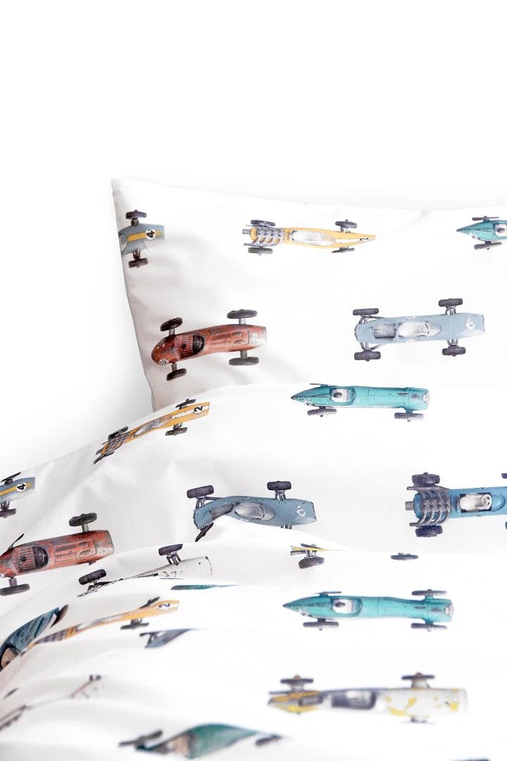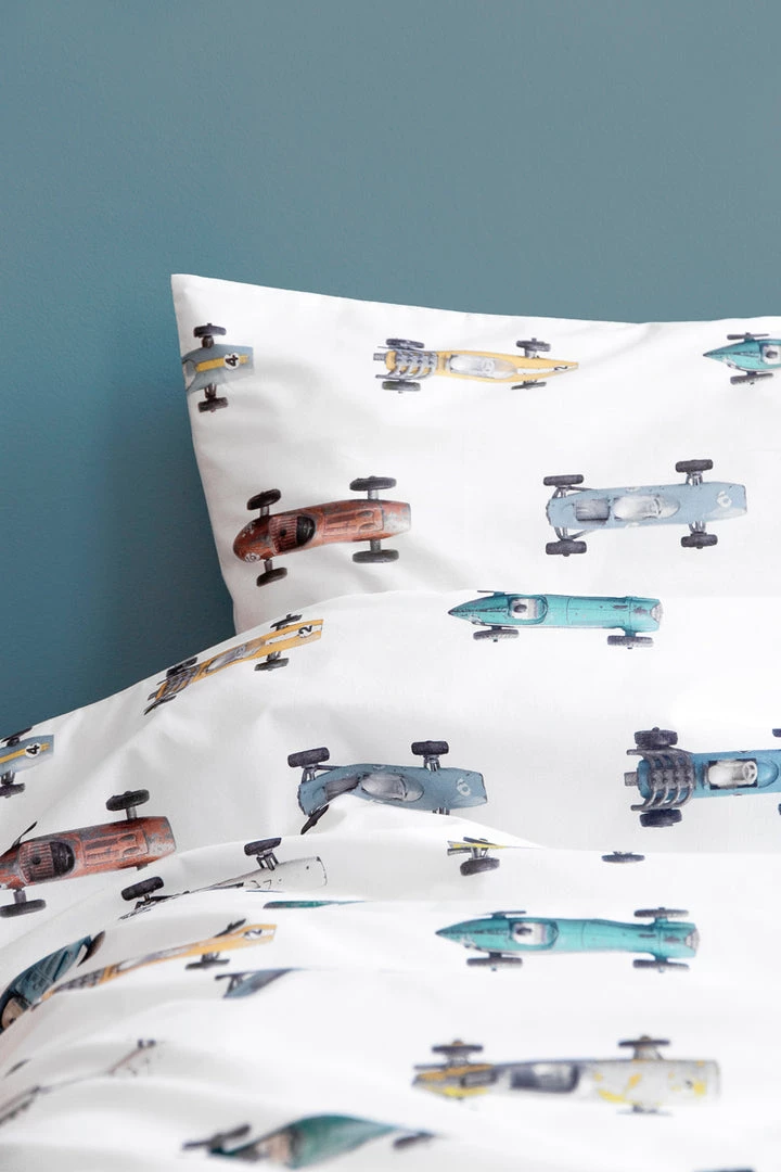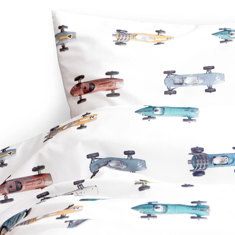 Studio Ditte duvet cover with classic race cars in a retro style & matching pillowcase comes in a single size. This cool bedding is perfect for kids who love Formula 1 racing cars and dream of becoming a rally car driver. The print is crisply displayed on a soft cotton. featuring retro style race cars in beautiful colour