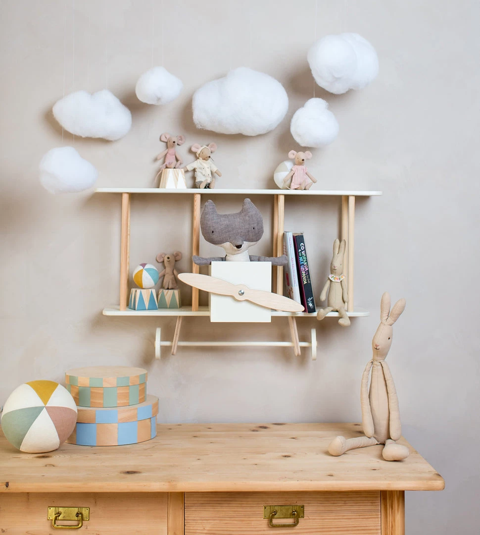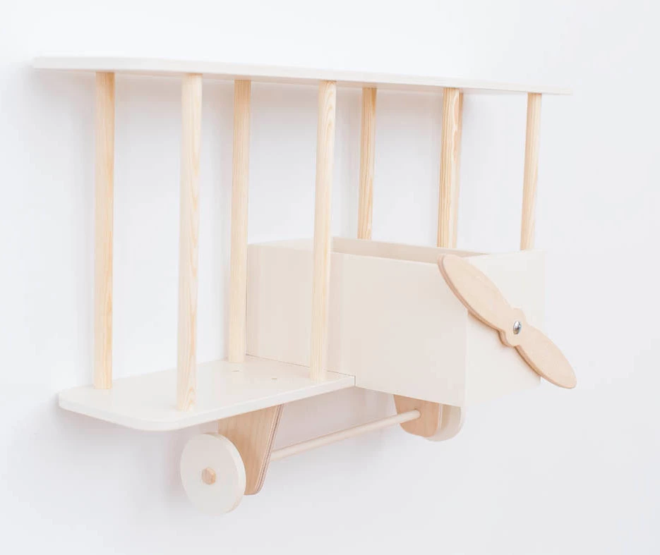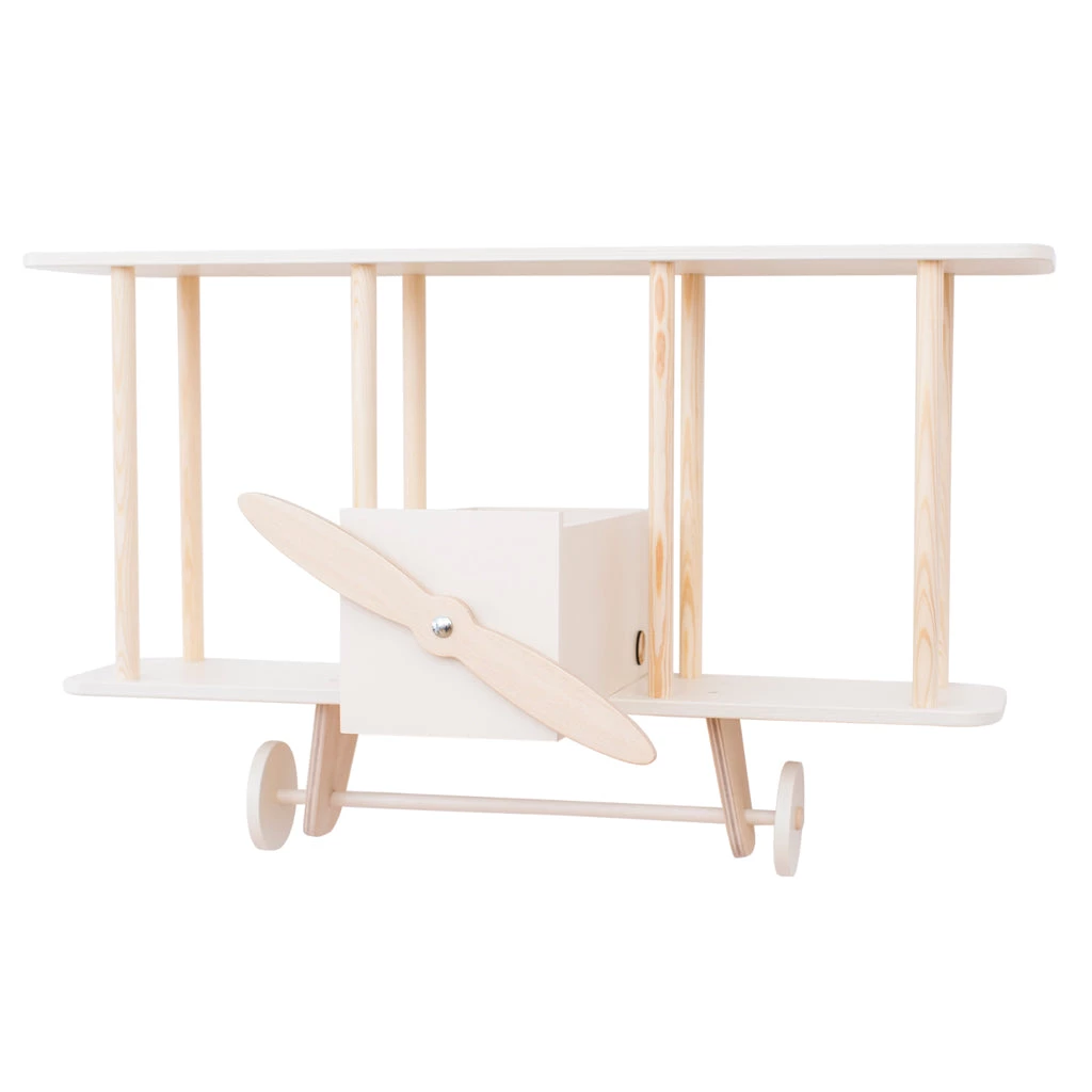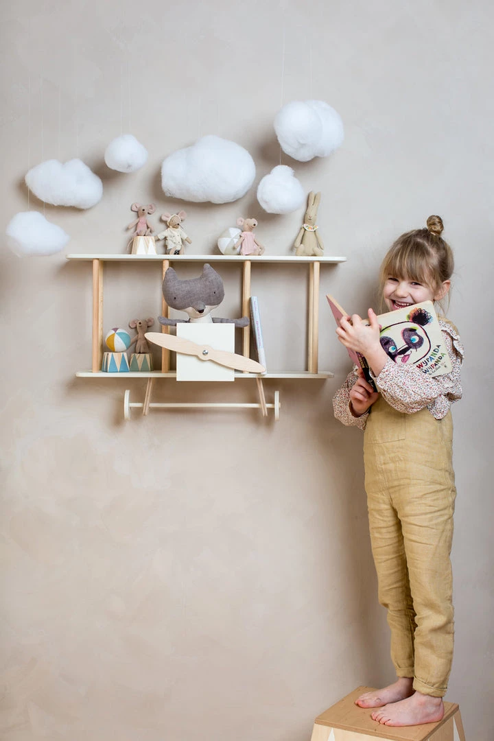 This stunning feature natural Bi-Plane kids wooden shelves from Up Warsaw has a cockpit for a small beloved teddy and lots of space for all your goodnight books as well as pens, teddys and other items.