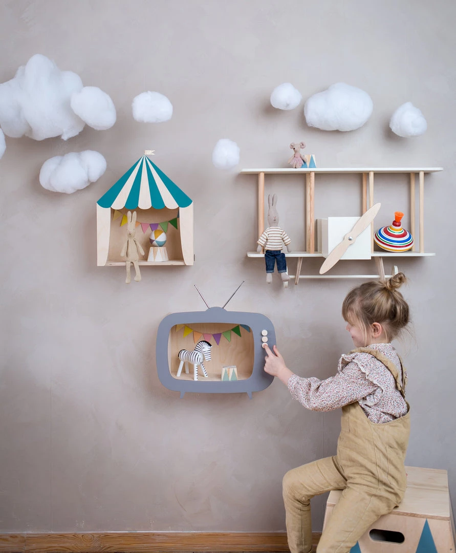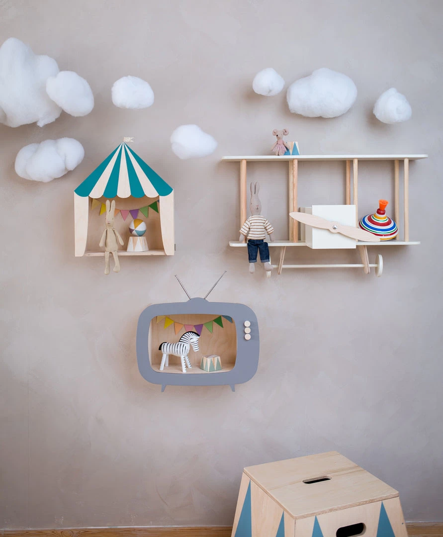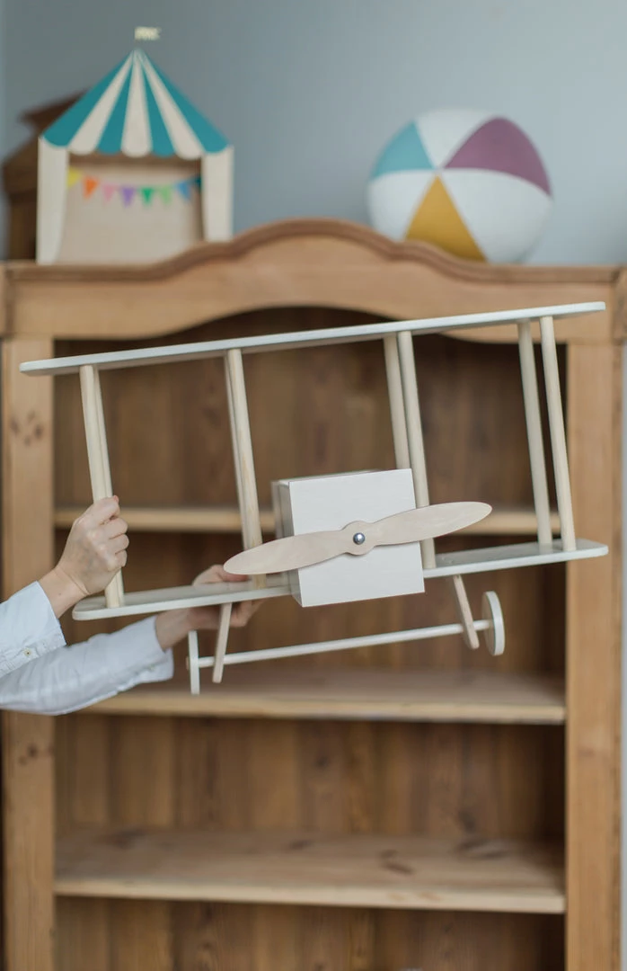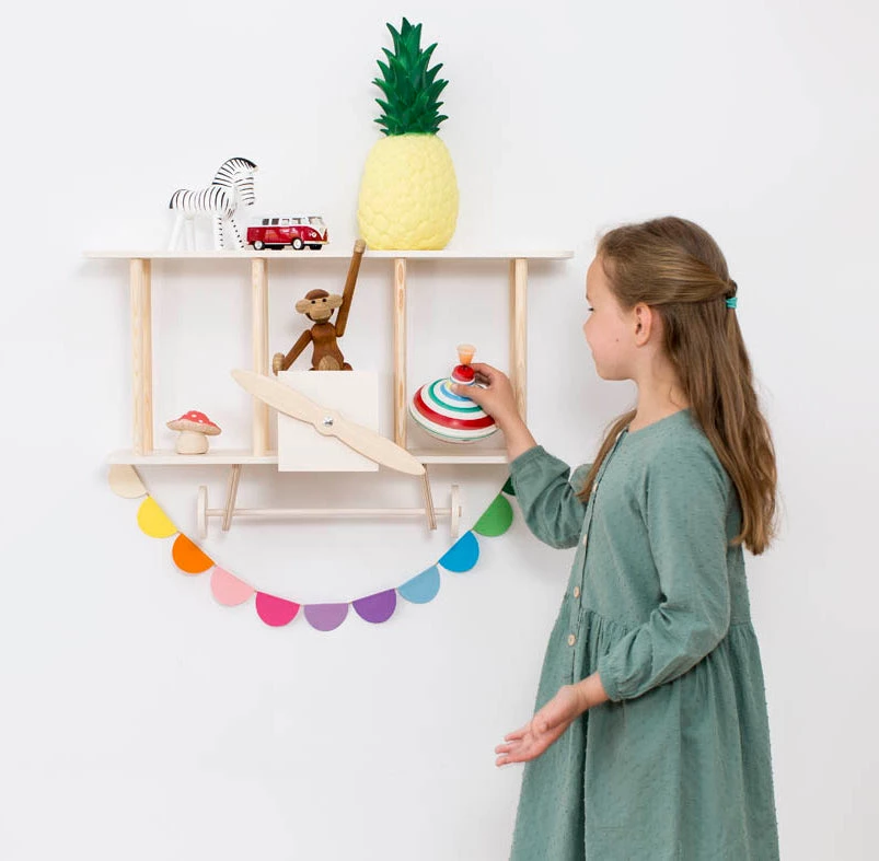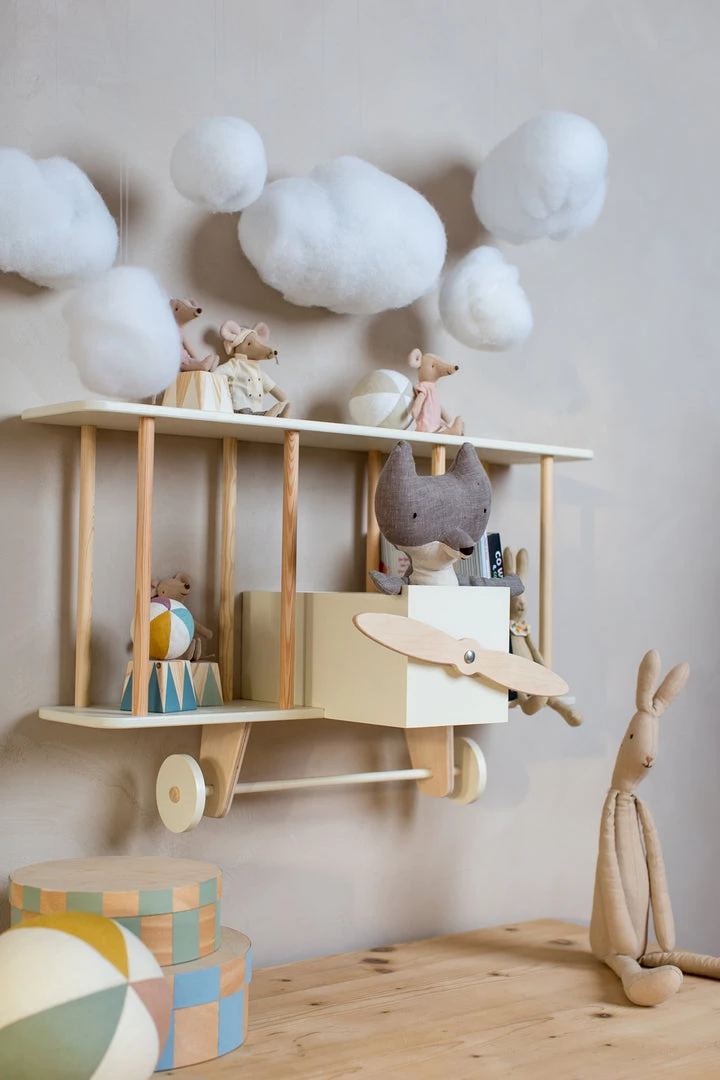 This stunning feature natural Bi-Plane kids wooden shelves from Up Warsaw has a cockpit for a small beloved teddy and lots of space for all your goodnight books as well as pens, teddys and other items.