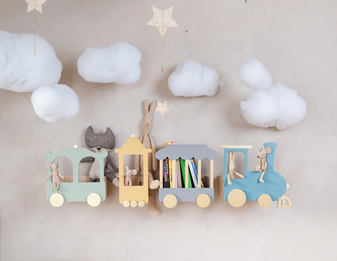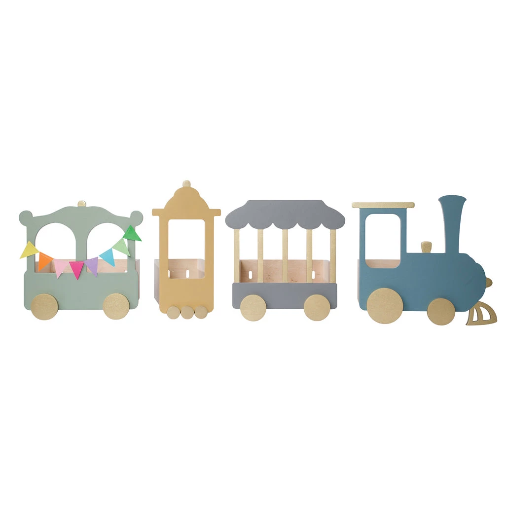 Color: shelves are wooden, the train fronts are: gold, ocean green, olive green, mustard yellow, dusty grey, dusty blue