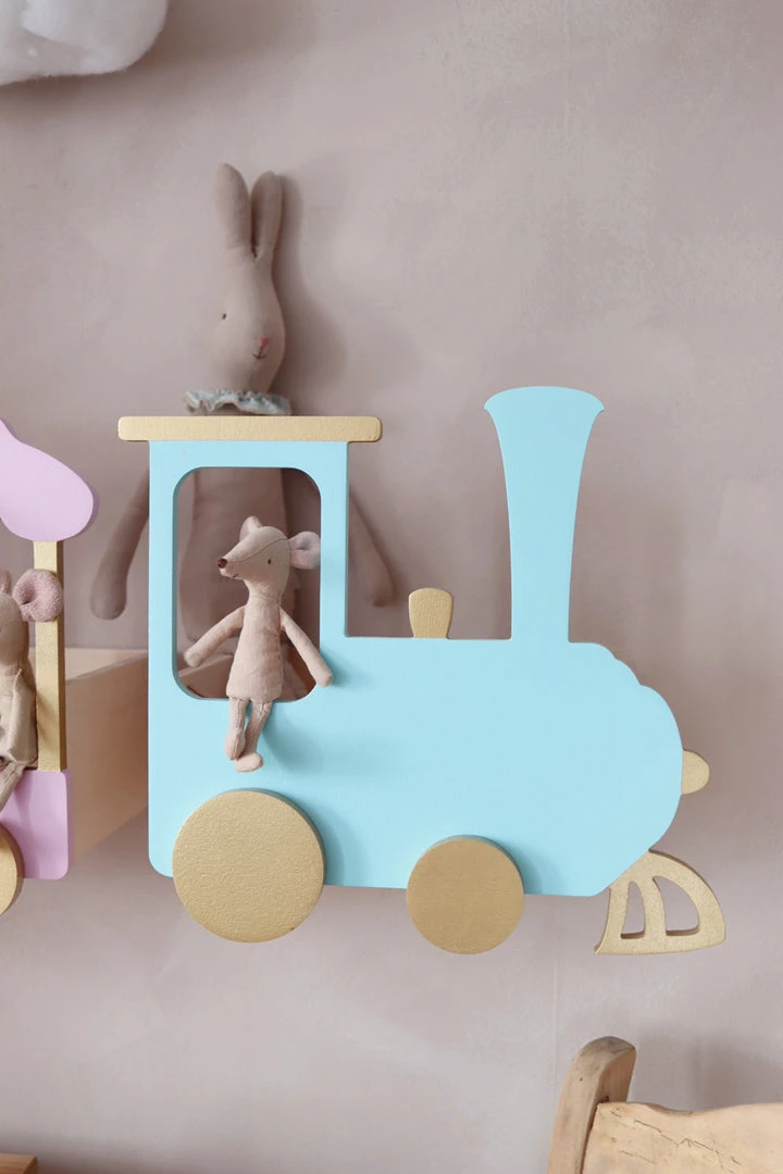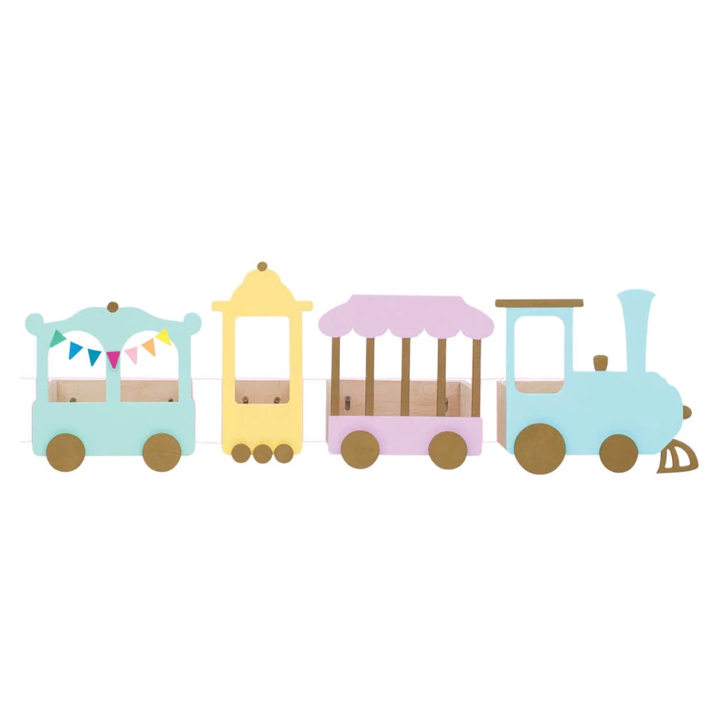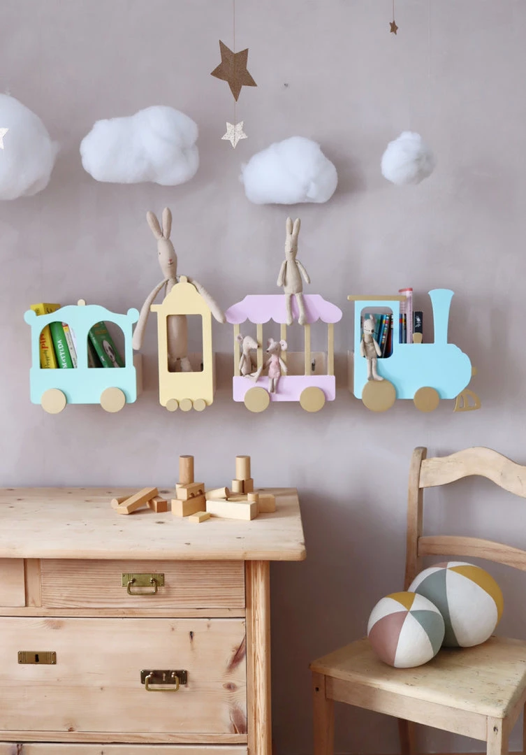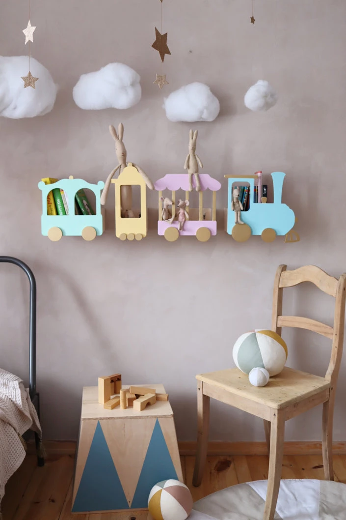 Color: shelves are wooden, the train fronts are: gold, light yellow, mint green, turquoise, light pink